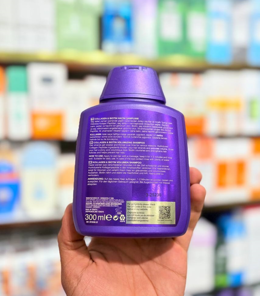 خصوصیات1)تقویت کننده و جلوگیری از ریزش مو 2)حاوی بیوتین و کلاژن 3)مناسب برای انواع مو 4)تقویت ساختار موهای نازک و ضعیفحجم300ml